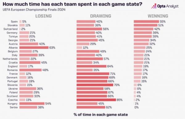 • 本届赛事西班牙55%比赛时间处于领先排第1,英格兰19%第13